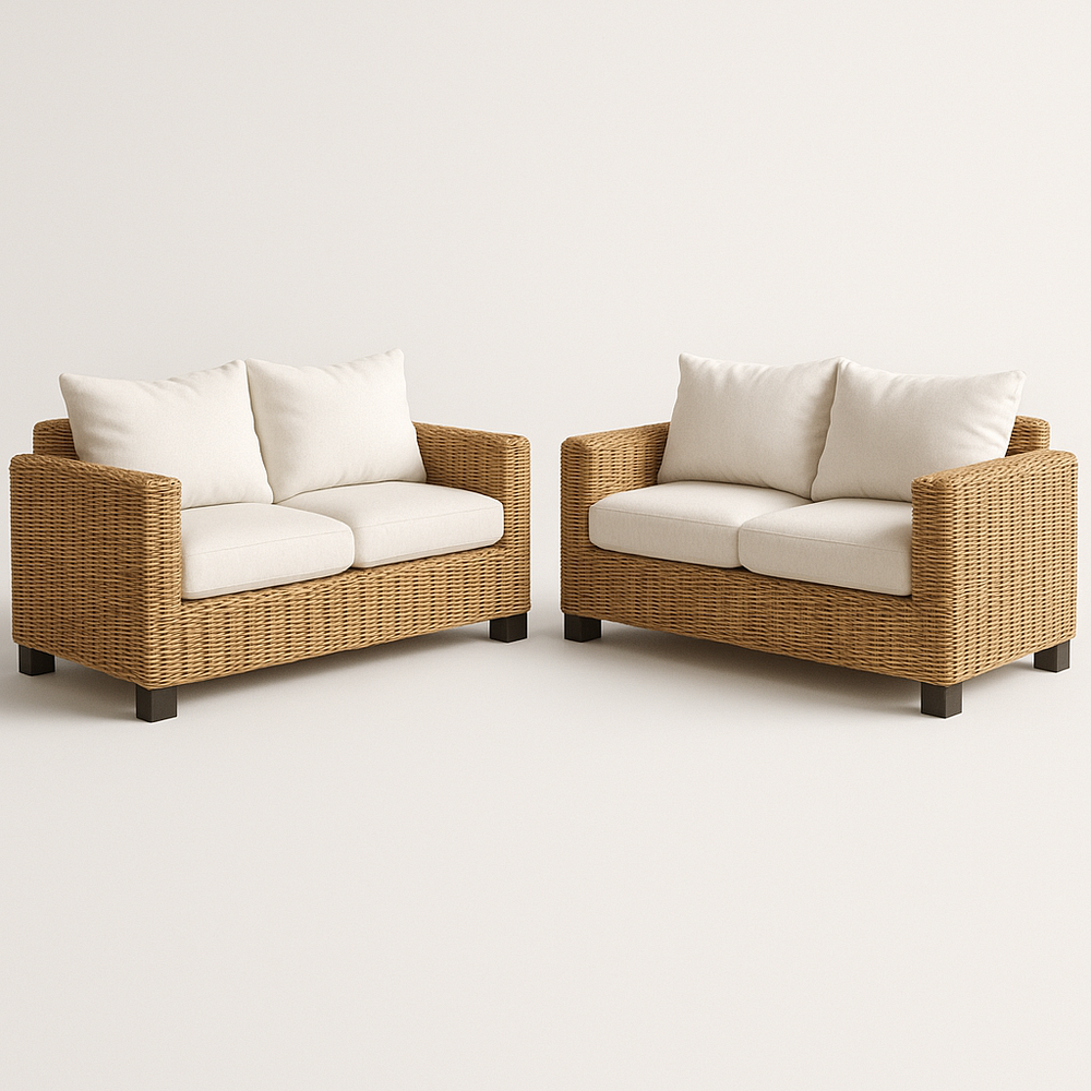 Ensemble de canapés 2 places Fabrication en rotin avec finition naturelle. Les coussins sont de couleur crème et offrent un confort optimal. Les structures sont solides avec des pieds en bois noirés. Dimensions approximatives de chaque canapé : longueur 160 cm, hauteur 75 cm, profondeur 85 cm.