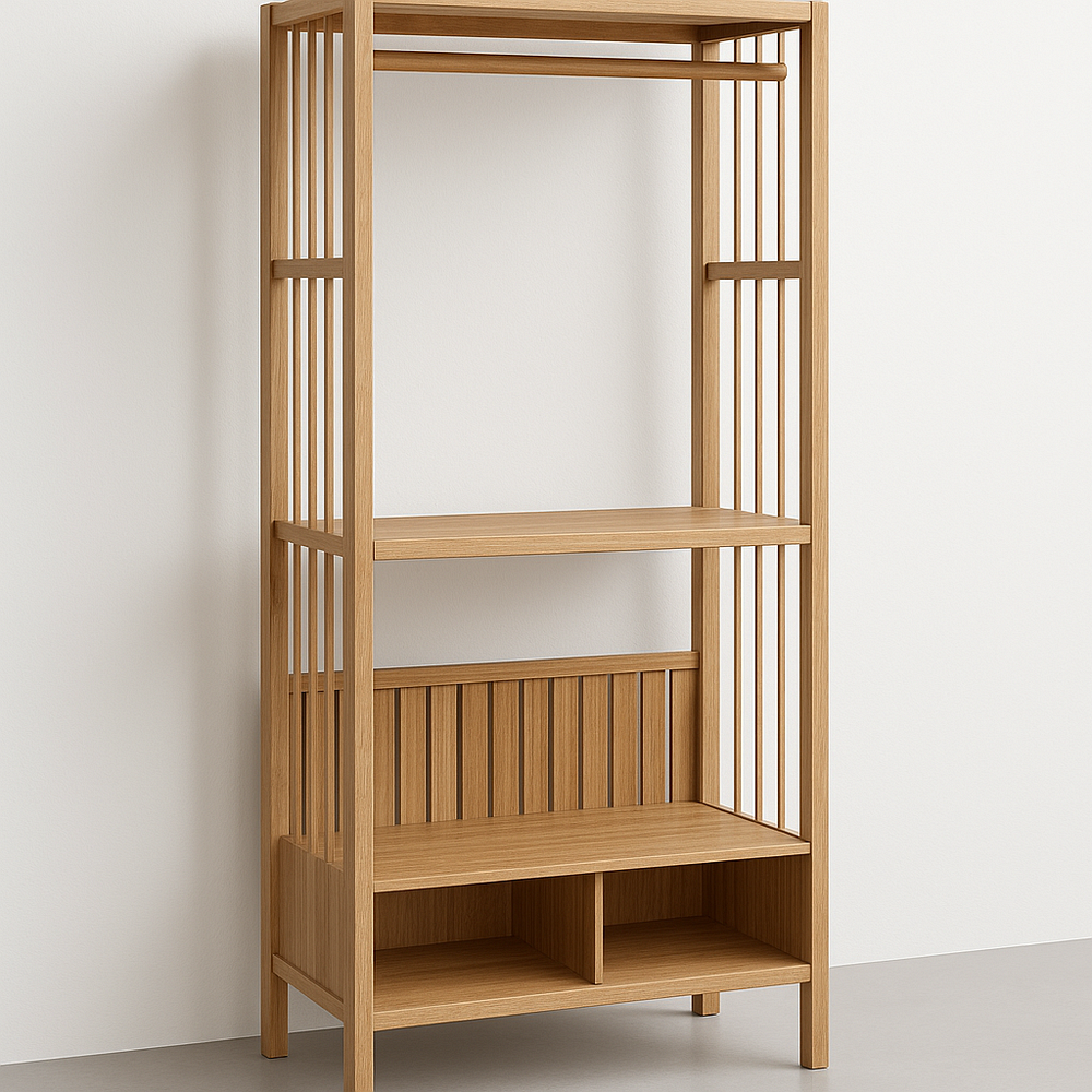 Etagère en bois de chêne avec une finition naturelle. Dotée de 3 niveaux, elle offre un espace de rangement spacieux et fonctionnel. Les panneaux latéraux sont conçus avec des barres verticales qui ajoutent une touche esthétique tout en assurant la stabilité de la structure. Les dimensions approximatives sont de 180 cm de hauteur, 90 cm de largeur et 45 cm de profondeur. Elle est idéale pour organiser divers objets dans un espace minimaliste.