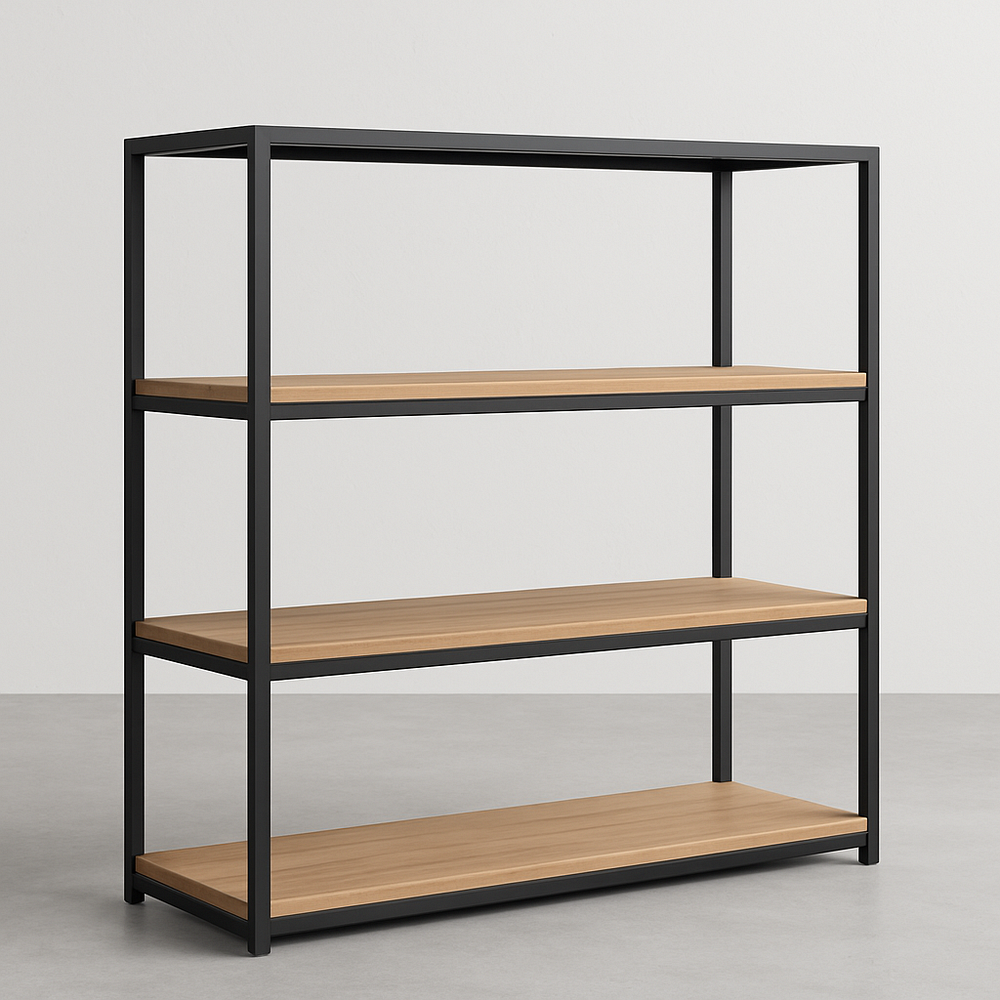 Étagère moderne composée de trois niveaux, idéale pour organiser vos livres ou objets décoratifs. La structure est en métal robuste avec une finition noire, offrant une stabilité et un design épuré. Les plateaux sont en bois avec une finition naturelle, ajoutant une touche de chaleur. Dimensions approximatives : hauteur 100 cm, largeur 90 cm, profondeur 30 cm.