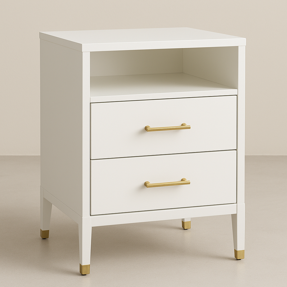 Cette table de chevet est fabriquée en bois avec une finition blanche élégante. Elle dispose d'une étagère ouverte et de deux tiroirs spacieux équipés de poignées en métal doré. Les pieds sont également ajustés avec des embouts dorés, ajoutant une touche moderne. Dimensions approximatives : 60 cm de hauteur, 45 cm de largeur et 35 cm de profondeur.