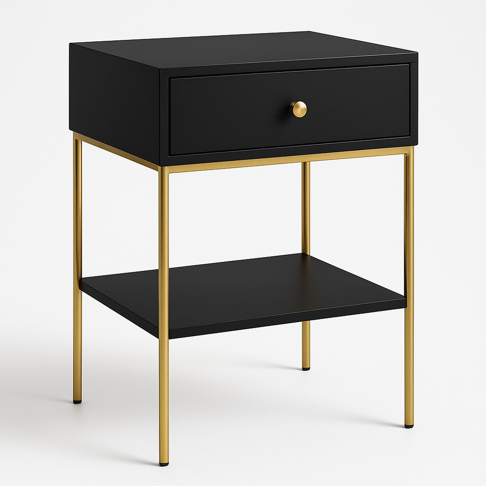 Table de Chevet Noir/Or Métal Rectangulaire avec Tiroir – 45x55x35 cm