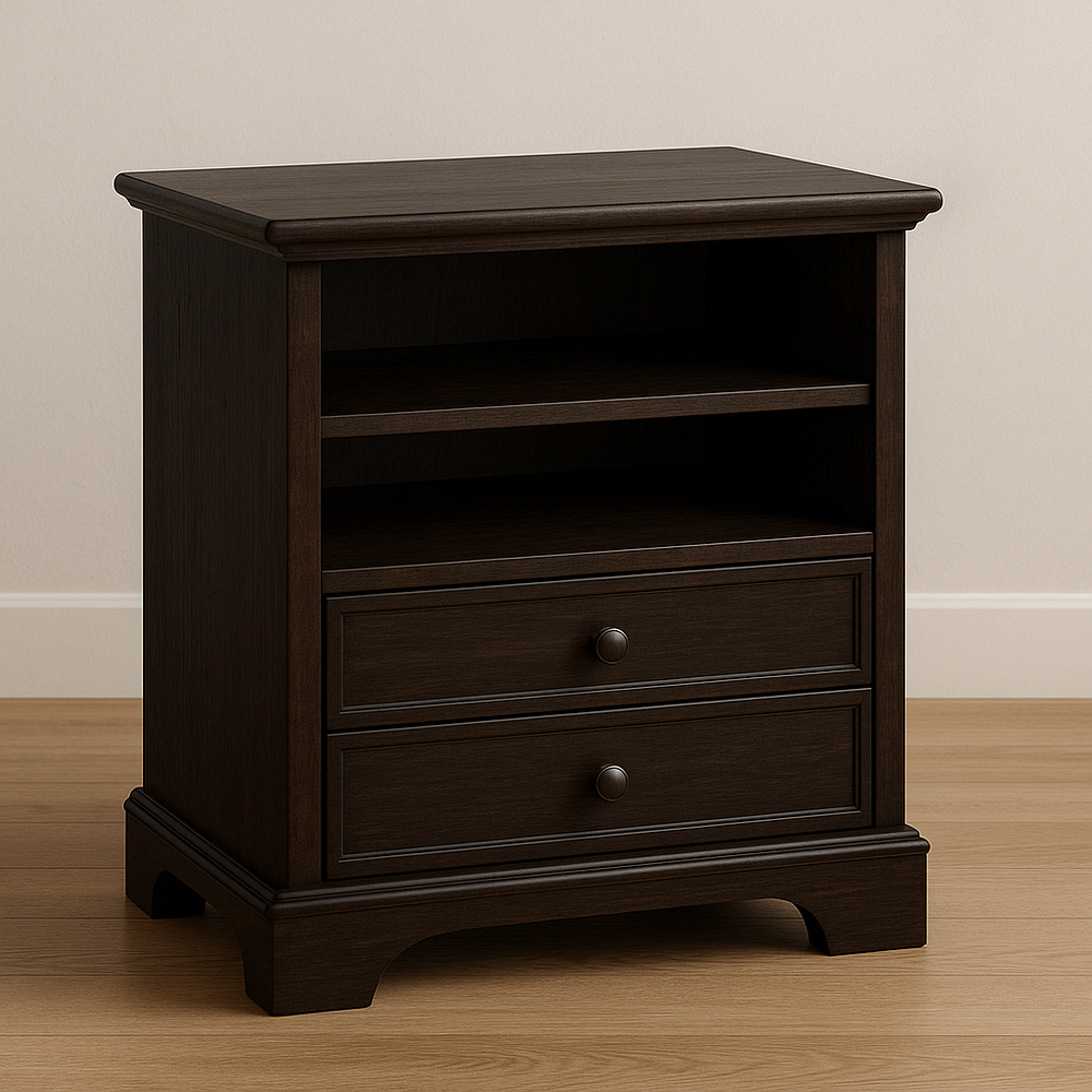 Table de nuit en bois avec une finition foncée et élégante. Comprend deux tiroirs et un espace de rangement ouvert au-dessus pour des articles supplémentaires. Fabriqué en bois massif avec une texture lisse et une construction robuste. Dimensions approximatives : 60 cm de hauteur, 50 cm de largeur, 40 cm de profondeur.